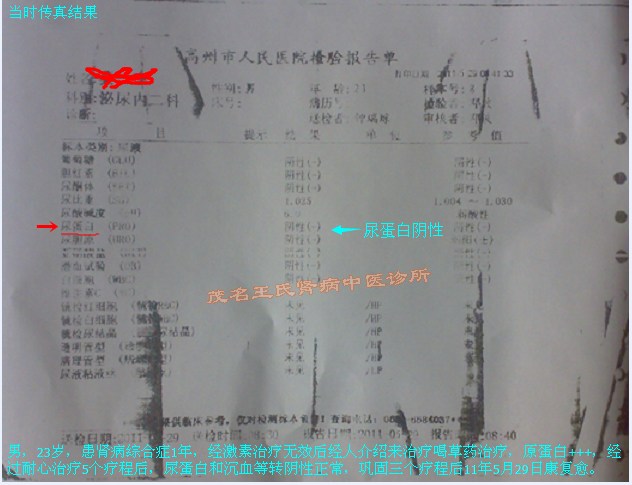 患者已看到有效果了,因此更有治疗信心了,患者说:不管时间长短我都会坚持治疗到病好。患者就这样坚持服药治疗,吃完一个疗程药后,24小时尿量达到2600毫升,原来眼皮与双下肢浮肿已消退七七八八了,病情在一天天恢复中,患者也在坚持每个疗程用药中,二疗程药,三疗程药坚持完,尿检蛋白已阴性,水肿全消,全身症状也得到改善。患者继续吃药中,治疗到了四、五个疗程药后,患者连续尿检蛋白都阴性。