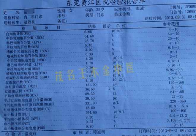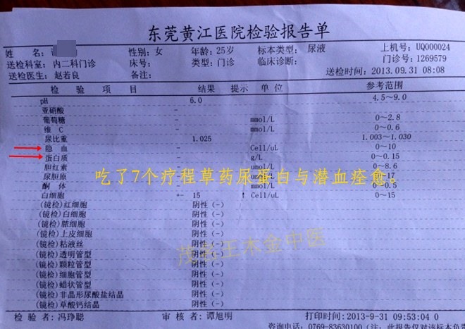 患者经过王氏草药治疗了五个疗程后,测尿蛋白大多时间都已转阴,只是有时加班或劳累过度时会出现弱阳性,还要继续用药,到第六个疗程后尿蛋白基本全天阴性(试纸测试),坚持最终都把问题解决好,患者反馈,每次测尿蛋白都是自己在家用试纸检测都正常,身体症状也没有了,准备停药可以吗。王大夫最后叫患者去医院尿检为准,如果尿检正常了再吃二个疗程补肾药进行巩固方可停药。患者于2013年9月21日去医院做尿检,报告出来,尿蛋白阴性,潜血阴性,(正常)(跟在家用试纸测的一样阴性),到这时患者肾炎基本愈了,最后,王大夫建议患者再吃二三个疗程巩固补肾药即可停药,最后,患者再一边工作边巩固吃药顺利过了巩固期用药,身体正气越来越好,病好以后也更加放心,最后,患者慢性肾炎痊愈,坚持就是胜利。