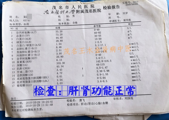 患者:吴先生,性别:男,年龄:32岁,已婚。住址:广东茂名市茂南区高山镇***村人,病史:1年。诊断:慢性肾炎、高血压;中医诊断:肝肾阴虚型。